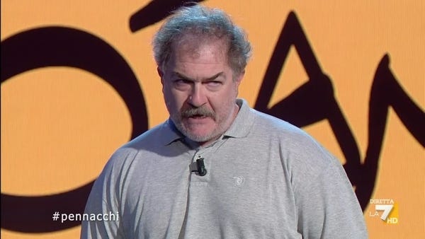 Il Pojana. Andrea Pennacchi. Egli è l’apice di quella sensazione di angoscia che dicevamo sopra, sul nostro tempo che non è ancora arrivato. Guardiamo Andrea Pennacchi e sentiamo l’angelo della vecchiaia seduto sul divano insieme a noi, che ci guarda mentre non ridiamo. Allora pensiamo: maledetto mietitore, anche noi dovremo passare per queste tue forche prima di incontrare sorella morte?